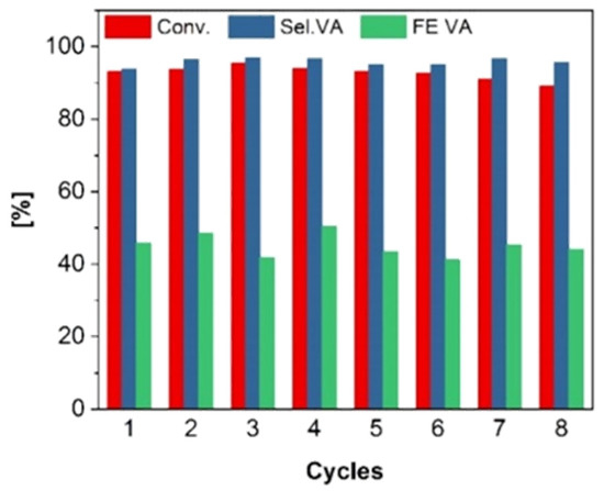 Compared with the traditional TCH of biomass-derived LA, the ECH of LA can be achieved in relatively mild conditions with the utilization of clean and sustainable water as a hydrogen source. Over the metallic Pb electrode, the high conversion of LA (93%) and excellent “apparent” selectivity to VA (94%) with a FE of 46% can be achieved with 0.5 M H2SO4 electrolyte and 0.2 M LA at an applied voltage of −1.8 V (vs. Ag/AgCl) for 4 h. In order to balance the ECH of LA and the H2 evolution, the adsorption hydrogen (Hads) should be controlled precisely by tuning the cell potential/current density, temperature, and electrolyte pH, inhibiting the Tafel and Heyrovsky steps, and promoting the formation of VA. Interestingly, the reaction performance does not change significantly after eight cycles. The surface of the metallic Pb cathode becomes rough, which may expose more active sites for the ECH of LA to VA. However, the corrosion behavior of the metallic Pb electrode in the acid system leads to the contamination of the products. It is thus necessary to improve the leaching-resistance of the cathode to achieve the environmentally friendly conversion of biomass in future research.
