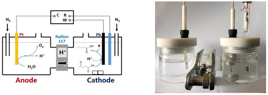 All electrochemical measurements were operated on an Autolab PGSTAT302N/FRA workstation equipped with a three-electrode system. The metal sheet after pre-treatment was used as the working electrode. The platinum sheet and Ag/AgCl (0.198 V vs. standard hydrogen electrode (SHE)) were applied as counter and reference electrodes, respectively. All electrode potentials in this study were reported versus Ag/AgCl otherwise specified. Electrochemical measurements were operated in a H-type cell divided by Nafion 117 membranes with 50 mL anode and cathode chambers (Figure 9). The geometric area of the working electrode was uniformly maintained at 1 cm2. During the whole experiment, the catholyte was purged nitrogen with stirring at atmospheric pressure. To investigate the ECH performance of LA over metal electrodes, linear sweep voltammetry (LSV) curves were tested with a scan rate of 50 mV s−1 in 0.5 M H2SO4 solution with and without LA. Chronoamperometry experiments were conducted at different applied potentials and other conditions for the organic substrates’ electrolysis in the reaction system.