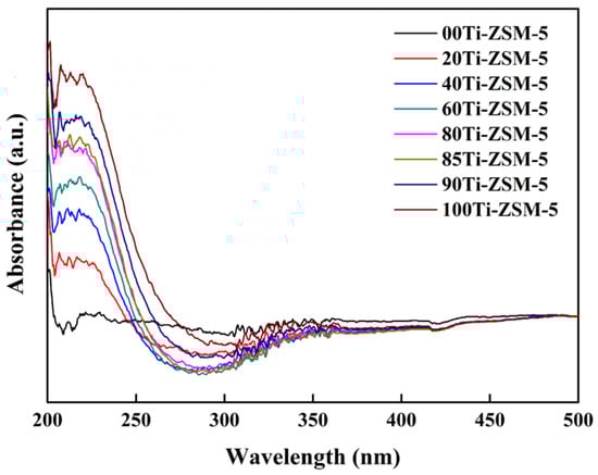 Figure 2 shows the UV-Vis analyses of Ti-ZSM-5 samples. The presence of an absorption peak at 205–220 nm and the absence of a peak at 330 nm revealed that Ti-ZSM-5 mainly contained the framework Ti, and was free of non-desired extra framework TiO2 phases [17]. The increase in absorption peak at 205–220 nm indicated that more Ti was present in the framework [18].