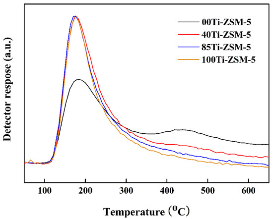 NH3-TPD was performed to study the effect of the substitution of Ti on the acidity of the catalyst. As shown in Figure 3, there are two peaks of NH3 desorption which correspond to stronger (situated above 300 °C) and weaker acidic sites (located below 200 °C), respectively. With the increase in Ti content, the peak area between 400 and 500 °C decreased, indicating the reduction in the number of stronger acidic sites of the samples. Replacing Si with Al in zeolite framework can create a defect (acidic site) [20]. With more Al substituted by Ti, the number of acidic sites was reduced due to the reason that titanium could not form the substitutional defect [21]. According to the results above, we could conclude that the substitution of Al by Ti was an effective way to control the acidity of the samples without the adverse effect on the diffusion of the catalyst.