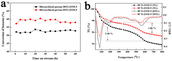 It is worth noting that although the benzene conversion of 85Ti-ZSM-5 remained between 58 and 60% during the first 40 h reaction on stream, the conversion of benzene showed a slight decrease in the next 20 h (Figure 4a). However, the benzene conversion of 00Ti-ZSM-5 showed the better stability in the 60 h reaction on stream. Comparing the content of coke on 85Ti-ZSM-5 and 00Ti-ZSM-5 (Figure 4b), the carbon deposition on 85Ti-ZSM-5 was still serious. Schmidt et al. [25] had reported that the coke distribution for HZSM-5 showed a homogeneous distribution of coke residuals over both inside and outside of the particle due to less diffusion restraints and the strong acid sites of deactivated material were not available for ammonia anymore due to the coverage of coke. The deactivation of 85Ti-ZSM-5 might be attributed to less strong acidic sites while 00Ti-ZSM-5 contained more strong acidic sites which could resist more coke. Therefore, reducing the amount of strong acid sites of HZSM-5 is favorable to suppress the side reaction of methanol to olefins but unfavorable to resist the carbon deposition, and it is important to investigate the method for suppressing coke formation on the HZSM-5 in future work.