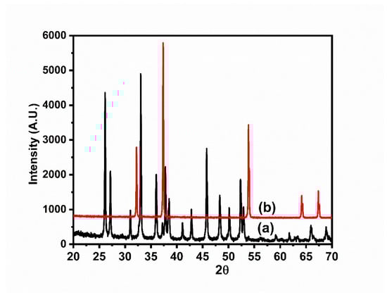 Figure 1 displays the XRD patterns of the GRS material before and after calcination at 900 °C. Before calcination, the diffraction pattern (Figure 1a) shows that the crystal structure of the shell sample is aragonite, a variety of the calcium carbonate, CaCO3, phase according to JCPDS (Joint Committee on Powder Diffraction Standard) file N°00-005-0453 [23,25]. After calcination of the GRS sample at 900 °C for 1 h (heating rate 10 °C·min−1), diffraction peaks appeared at 2θ = 32.26, 37.44, 53.9° (Figure 1b), which are characteristic of CaO (JCPDS N°00-02-0968) [23]. Such a temperature was selected as a suitable calcination temperature to produce the CaO catalyst from the GRS shell according to the TG/DTA analysis.