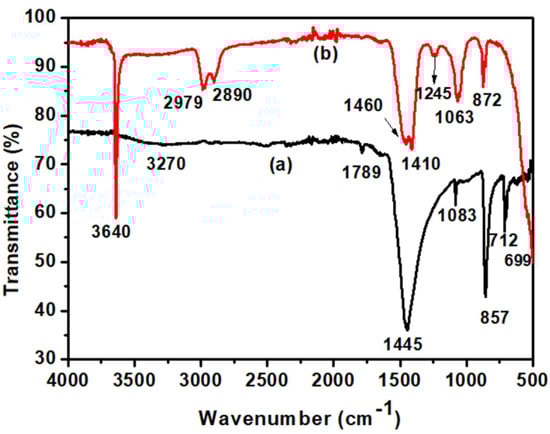 The FT-IR spectrum of the GRS powder is displayed in Figure 2, curve a. The spectrum shows bands located at 1445, 1083 and 857 cm−1 attributed to ν1, ν2 and ν3 vibration modes of carbonate ions that are typically found in aragonite polymorph calcium carbonate [26]. In addition, the doublet at 699 and 712 cm−1 was assigned to the ν4 vibration mode of carbonate ions. The small band observed at 1789 cm−1 is due to the C=O stretching vibration [23,26]. The presence of water molecules in the un-calcined sample was confirmed from the broad peak which appeared at around 3270 cm−1. In Figure 2, curve b is the spectrum of the GRS shell after calcination at 900 °C. It is worth noting that the easily formed CaO reacts with the moisture and CO2 present in the atmosphere. Accordingly, the strong peak at 3640 cm−1 was attributed to strongly chemisorbed water or to OH groups [23]; additionally, the two bands at 2979 and 2890 cm−1 were ascribed to the stretching of perturbed OH groups [27]. The bands at 1460, 1410, 1245, 1063 and 872 cm−1 were assigned to the C–O stretching and bending, ν1, ν2, ν3 and ν4 vibration modes, respectively, of calcium carbonate species formed upon CO2 adsorption on CaO [23,26].