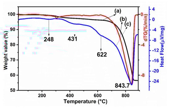 Simultaneous thermogravimetric/differential thermal analyses (TG/DTA) were carried out on a Labsys TM Evo (1F) Setaram apparatus, by heating from room temperature up to 900 °C with an increasing rate equal to 10 °C·min−1, under air flow (60 mL min−1).