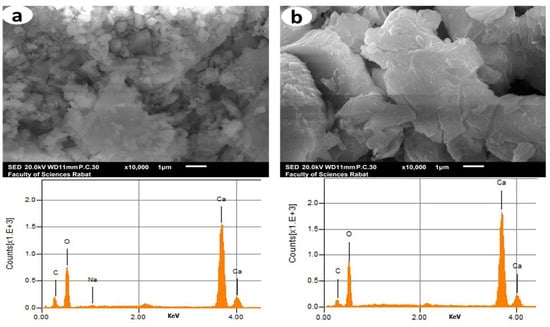 The morphological features of the un-calcined GRS shell and of the resulting material after calcination at 900 °C were studied by Scanning Electron Microscopy (SEM). The un-calcined GRS shell exhibits rod and spherical particles with irregular sizes (see Figure 4a). After calcination at 900 °C (see Figure 4b), agglomerated irregular particles are visible; moreover, a macro-porous structure appears, with many voids and intraparticle spaces, likely due to the evolution of gaseous species, such the release of water, organic matter and CO2 due to the decomposition of CaCO3 to CaO.