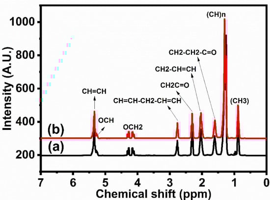 1H-NMR spectra of (a) refined cooking oil and (b) waste cooking oil.