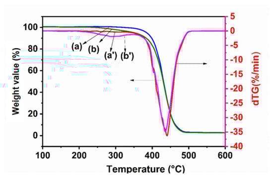 The application of a thermogravimetric analysis has been widely reported in the literature as a useful technique for the characterization of oils, as well as of derived biodiesels [31]. Figure 7 reports the TG/DTG results for the refined and used oils investigated in the present article. The weight curve of the two oil samples started to significantly decrease at around 375 °C, and it continued until total degradation at 445 °C (see DTG curves a’, b’). However, the waste oil curve presented an additional first small loss at 290 °C (Figure 7, curves b, b’) that was assigned to the oxidation of free fatty acids that are formed during frying. Thus, although the thermogravimetric profiles of the refined and waste oils are quite similar, the small feature at around 300 °C is an important characteristic that depends on the free fatty acids content; therefore, TG/DTG is a helpful method for discriminating between mixtures of different oils.