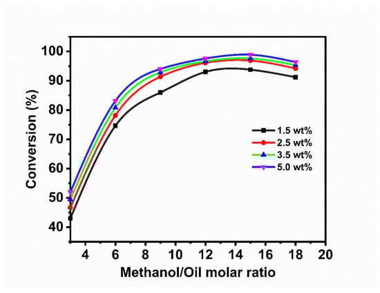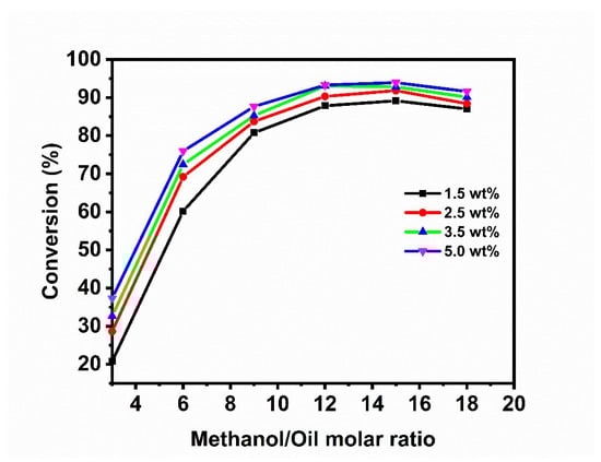 Figure 8 and Figure 9 display the results obtained in the transesterification reaction of waste and refined oils, respectively, working at different weight contents of the catalyst with respect to the oil, in the range of 1.5 to 5 wt%. The conversion of the waste oil increased by increasing the methanol/oil molar ratio up to 12:1 and remained stable at 15:1. At a given methanol/oil ratio, the conversion values increased by using a higher amount of catalyst, with the highest conversion, equal to 94%, achieved in the presence of 5 wt%. At a methanol/oil molar ratio of 18:1, the conversion diminished to ~91% with 5 wt% of catalyst, while a value of 87% was registered by using the lowest amount of catalyst, 1.5 wt%.