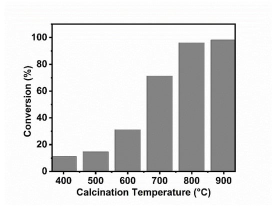 As shown in Figure 10, the conversion slightly increases by increasing the calcination temperature from 400 to 600 °C, then rises quite rapidly by calcining the natural shell in the range of 600–700 °C, and the maximum conversion is reached at 800–900 °C when CaO is formed.