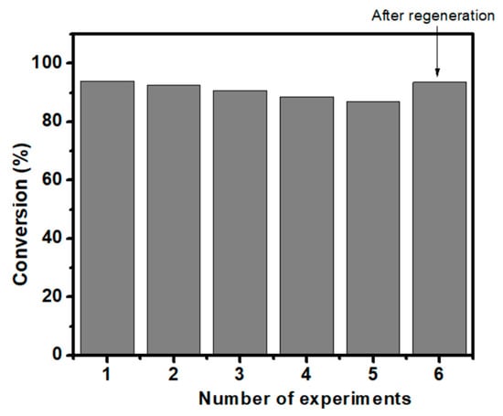 Stability in catalytic conversion and recycling are very important parameters of a heterogeneous catalyst for a wide application [20]. Thus, to test the stability of the catalyst and its use for practical applications, the transesterification reaction was carried out by using waste oil, 5 wt% of the catalyst in the same conditions as previously reported. At the end of each test, the catalyst was filtered, washed with methanol, dried and reintroduced into the reactor. Fresh amounts of oil and methanol were added and allowed to react for a further 3 h at a temperature of 65 °C. This procedure was repeated five times. The results are displayed in Figure 11. In the first catalytic test, 94% of conversion was achieved (according to previously results, as shown in Figure 8, and confirming the reproducibility of experiments); then, the conversion slightly decreased, test by test, up to 87% during the fifth cycle. After that, the recovered catalyst was treated with methanol in an ultrasounds bath for 20 min at the end of each washing step, the powder was filtered and another portion of fresh methanol was added, and the procedure was repeated five times. The XRD characterization (data not shown) of the material washed this way revealed peaks of Ca(OH)2, CaCO3 and CaO; therefore, before a further catalytic test (sixth cycle), calcination at 900 °C was performed. The biodiesel yield registered in the sixth cycle was as high as 93.6%, quite close to the performance of the freshly used catalyst.