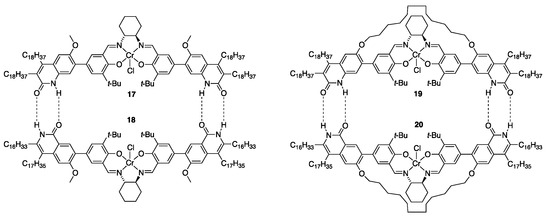 Wärnmark and coworkers [35,36] explored hydrogen-bonded supramolecular catalysts, designing Cr–salen complexes capable of forming heterodimers through complementary hydrogen-bonding motifs (complexes 17 and 18 in Figure 5). In addition, complexes containing an alkyl strap were also synthesized (complexes 19 and 20 in Figure 5) in order to force the hydrogen-bonding moieties of the monomers into a favorable conformation to assist the aggregation of the desired cyclic heterodimer. The ARO of cyclohexene oxide and cyclopentene oxide with TMSN3 in toluene was used to evaluate the supramolecular systems. Kinetic studies showed that the supramolecular systems 17 + 18 and 19 + 20, respectively, gave higher reaction rates than monosalen catalyst 1 (Scheme 4) with the strapped systems showing the highest catalytic efficacy. The effect was most pronounced at lower catalyst concentrations. As an example, at 5 mM catalyst concentration in toluene, the strapped system 19 + 20 gave eight times higher initial rate than monosalen catalyst 1 for the ARO of cyclohexene oxide. Studies also indicated that more than one reaction mechanism may be involved in the catalysis involving these systems. The induced enantioselectivity was, however, significantly lower (<10% ee) than what was obtained with catalyst 1. Equilibrium studies on similar studies by the Wärnmark group [37] showed that only a fraction of the supramolecular assemblies contained the cyclic dimeric structure in solution. Hence, the catalysis was, instead, most likely conducted by a mixture of open, linearly aggregated species.