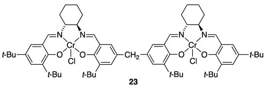 Jacobs and coworkers also explored monomeric complex 1 (Scheme 4) and dimeric complex 23 (Figure 7) impregnated on unfunctionalized silica [44,45]. The heterogeneous catalysts were used in the ARO of cyclopentene oxide and cyclohexene oxide with TMSN3. All reactions were performed in hexane. The catalyst based on monomeric complexes exhibited moderate reactivity and enantioselectivity (47–98% yield and 30–45% ee), and while leaching was limited, the silica support suffered some deterioration after repeated experiment [45]. The catalyst based on dimeric complex 23 (Figure 7) gave higher yields (74–98%) and improved, although still moderate, enantioselectivities (50–68% ee). Using the catalyst in a continuous-flow reactor reduced the deterioration of the support, although these experiments were only performed for the KR of 1,2-epoxyhexane with TMSN3 [44]. In later studies, the dimeric Cr–salen complex was also immobilized in a silica-supported ionic liquid, using ionic liquid [bmim][PF6] (bmim = 1-butyl-3-methylimidazolium) [46]. This type of heterogenization resulted in both increased reactivity and enantioselectivity compared to the dimeric catalyst impregnated on silica (93% yield and 75% ee in the ARO of cyclohexene oxide with TMSN3), as the catalyst in the supported ionic liquid phase was more accessible for reaction than when adsorbed on a silica surface. The catalyst and the ionic liquid could be recovered by Soxhlet extraction with acetone and recycled without loss of enantioselectivity. As reported for the catalysts impregnated on silica, the support shows some deterioration over time, but this could again be improved by using a continuous-flow reactor.