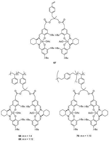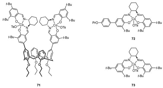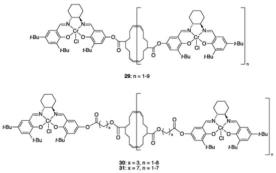 Inspired by Weck’s [48] work on hydrolytic kinetic resolution (HKR) of terminal epoxides, Liu and coworkers [49] studied the catalytic properties of macrocyclic oligomer-supported Cr–salen catalysts in the ARO of cyclohexene oxide with TMSN3. Catalysts with different linker lengths between the salen complex and the oligomers were synthesized and compared (catalysts 29–31, Figure 10). The catalysts were obtained as mixtures of different ring sizes (dimers to decamers) and used as such in the catalytic studies. Reactions carried out with 0.2 mol% catalyst loading in diethyl ether gave significantly higher catalytic activity, enantioselectivity and reaction rates than for the monomeric catalyst 1 (Scheme 4) under the same conditions. The catalyst with the shortest linker (catalyst 29) showed the highest reaction rate (17 times higher initial TOF than monomeric catalyst 1) and the catalyst with the longest linker (catalyst 31) gave the highest enantioselectivity (82% ee), demonstrating the importance of distance and relative orientation of the Cr–salen complexes in multi-metallic catalysts. The catalysts could be recovered by precipitation with acetone and recycled up to five times with maintained reactivity and enantioselectivity.