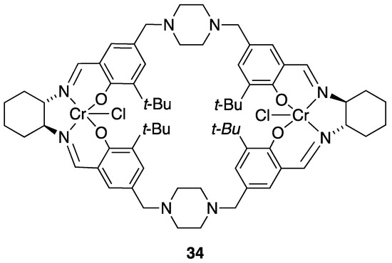 The same group also synthesized and evaluated a series of enantiopure macrocyclic Cr–salen complexes with different counter ions [56]. After the screening of different reaction conditions, optimal results were obtained for reactions performed in CH2Cl2/MeOH (9:1 v/v) with 0.5 mol% catalyst loading using catalyst 34 (Figure 14). These conditions were used for the ARO of a limited number of cyclic and acyclic meso-epoxides with aniline, giving the products in excellent yields (98–99%) and high enantioselectivities (up to 91% ee). The catalyst could be recycled up to four times without loss of reactivity or enantioselectivity.