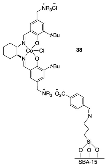 Islam and coworkers [61] also immobilized Co–salen complexes on mesoporous silica. The Co–salen complexes were grafted on the material through non-covalent interactions between quaternary amine groups on the salen units and carboxylate units on the functionalized silica (catalyst 38, Figure 16). The material showed excellent catalytic activities for the ARO of cyclohexene oxide with a number of aromatic and cyclic amines under solvent-free conditions, with short reaction times (1–2.5 h), high yields and high enantioselectivities (87–97% yield and 77–99% ee). After the reaction, the catalyst could be recovered by precipitation and centrifugation and then recycled without loss of reactivity or enantioselectivity and with no detectable metal leaching.