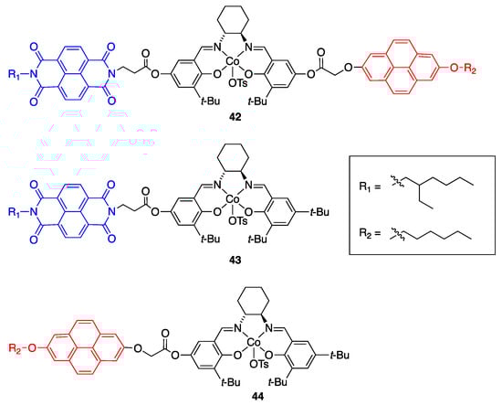 The same research group also developed catalytically active molecular tweezers based on the same design principle with a single Rh(I) center acting as the hinge [34]. This complex allowed for reactions to be run in THF instead of benzonitrile. Using the catalyst in the ARO of cyclohexene oxide with TMSN3 yielded products with up to 80% ee, compared to 26% ee obtained with complex 1 under the same reaction conditions. The closed form of the catalyst maintained a high enantioselectivity over a range of concentrations, while the open (linear) form exhibited significantly decreased enantioselectivity at lower concentrations.