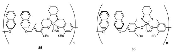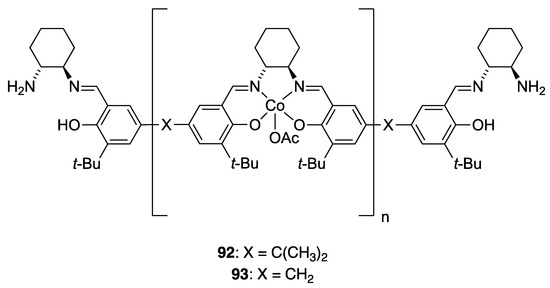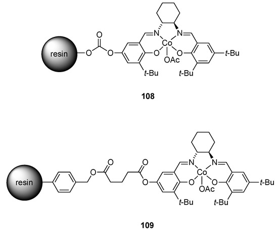 One area of interest has been the development of heterogeneous metal–salen catalysts, as this potentially allows for an easier product separation and catalyst recovery [14,15,38]. Several different strategies have been explored for the immobilization of metal–salen complexes on different solid supporting materials [39]. In addition to the reactivity and enantioselectivity, the heterogeneous catalysts also need to be evaluated in terms of stability, leaching, and recyclability.