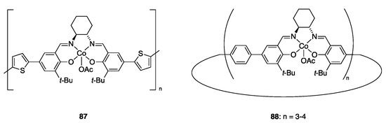 Schulz and coworkers [38] synthesized a chiral calixsalen-type chromium complex that was employed as a heterogeneous catalyst in the ARO of cyclohexene oxide and 3,4-epoxytetrahydrofuran with TMSN3. The macrocyclic catalyst 28 contains 2–5 repeating thiophene-salen units and was used as an oligomeric mixture (Figure 9). The reaction was performed under heterogeneous conditions in tert-butyl methyl ether (TBME), and the catalyst could be recovered by filtration and recycled several times. The products were obtained in good yields (62–90%) and moderate enantioselectivities (42–62% ee).