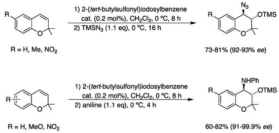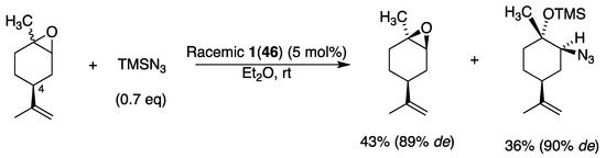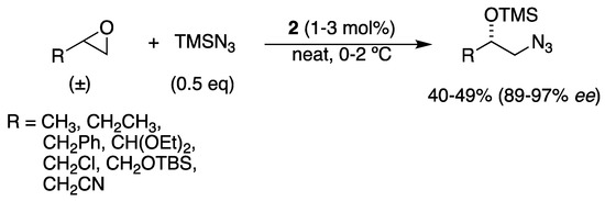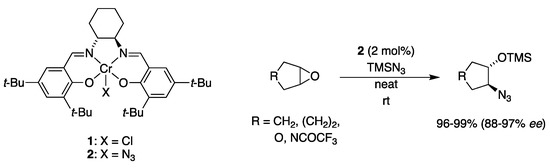 The seminal work of Jacobsen and coworkers on chiral Cr–salen complexes for the asymmetric catalysis of the azidolysis of meso-epoxides have yielded invaluable insight in the development of catalysts for the ARO of epoxides. Drawing on knowledge gained in their previous work on the asymmetric epoxidation of alkenes [24,25,26], they found that by using the same salen ligand and exchanging the manganese(III) for chromium(III) (complex 1), the ARO of cyclic meso-epoxides with TMSN3 as nucleophile could be catalyzed in high yields and with high enantioselectivities (up to 99% yield and 97% ee, Scheme 4). The reactions could be conducted either in ethereal solution or under solvent-free conditions with similar yields and enantioselectivities [20,27].