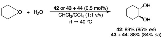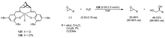 - Nielsen, L.P.C.; Stevenson, C.P.; Blackmond, D.G.; Jacobsen, E.N. Mechanistic investigation leads to a synthetic improvement in the hydrolytic kinetic resolution of terminal epoxides. J. Am. Chem. Soc. 2004, 126, 1360–1362. [Google Scholar] [CrossRef] [PubMed]
