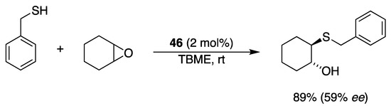 - Wu, M.H.; Jacobsen, E.N. Asymmetric ring opening of meso epoxides with thiols: Enantiomeric enrichment using a bifunctional nucleophile. J. Org. Chem. 1998, 63, 5252–5254. [Google Scholar] [CrossRef]