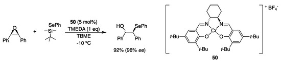 - Yang, M.; Zhu, C.; Yuan, F.; Huang, Y.; Pan, Y. Enantioselective Ring-Opening Reaction of m eso-Epoxides with ArSeH Catalyzed by Heterometallic Ti−Ga−Salen System. Org. Lett. 2005, 7, 1927–1930. [Google Scholar] [CrossRef]