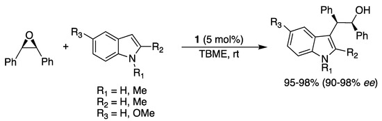 - Bandini, M.; Cozzi, P.G.; Melchiorre, P.; Umani-Ronchi, A. Kinetic Resolution of Epoxides by a C-C Bond-Forming Reaction: Highly Enantioselective Addition of Indoles to cis, trans, and meso Aromatic Epoxides Catalyzed by [Cr (salen)] Complexes. Angew. Chem. Int. Ed. 2004, 43, 84–87. [Google Scholar] [CrossRef] [PubMed]