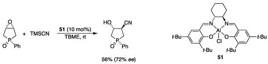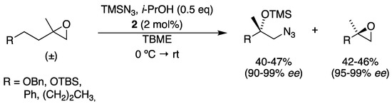 - Larrow, J.F.; Schaus, S.E.; Jacobsen, E.N. Kinetic resolution of terminal epoxides via highly regioselective and enantioselective ring opening with TMSN3. An efficient, catalytic route to 1, 2-amino alcohols. J. Am. Chem. Soc. 1996, 118, 7420–7421. [Google Scholar] [CrossRef]