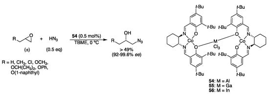The enantioselective ring-opening of epoxides with azides is a very important reaction due to the facile conversion of the products into valuable vicinal amino alcohols of very high optical purity (Scheme 3) [16,17,18,19]. The first report of a metal–salen catalyst used for an ARO reaction came from Jacobsen and coworkers [20] in 1995 with the use of Cr(III)salen complex 1 for the ARO of epoxides with trimethylsilylazide (TMSN3) as nucleophile (Scheme 4). Since then, considerable efforts have been invested into improving this catalytic system, including developing multi-metallic catalysts and employing different heterogenization strategies. The Cr(III)salen complexes remain the most investigated catalysts for the ARO of epoxides with azides as nucleophile, and only a few less efficient salen complexes based on other metals can be found in the literature [21,22,23].