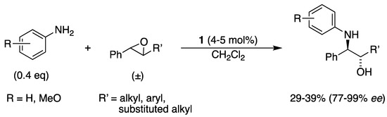 Bartoli and Melchiorre [54] employed Cr–salen complex 1 (Scheme 4) in the ARO of meso-stilbene oxide with anilines as nucleophiles. Reactions carried out in dichloromethane with 10 mol% catalyst loading afforded the corresponding amino alcohols with high yields, complete diastereocontrol (only the syn-isomer was observed) and high enantioselectivity (Scheme 8). The use of a catalytic amount of Et3N as an additive was found to give a significantly enhancement of the enantioselectivity (from 76% to 90% ee for reaction with aniline) but caused a moderate loss of reactivity.