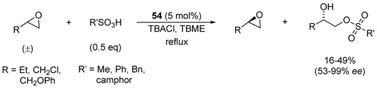 - Lee, Y.W.; Yang, H.C.; Kim, G.-J. Synthesis of Highly Enantiomerically Enriched Arenesulfonic Acid 2-Hydroxy Esters via Kinetic Resolution of Terminal Epoxides. Appl. Chem. Eng. 2016, 27, 490–494. [Google Scholar] [CrossRef][Green Version]