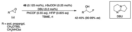 - Kalow, J.A.; Doyle, A.G. Enantioselective ring opening of epoxides by fluoride anion promoted by a cooperative dual-catalyst system. J. Am. Chem. Soc. 2010, 132, 3268–3269. [Google Scholar] [CrossRef]