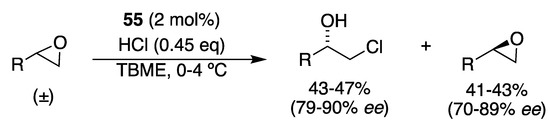 - Tokunaga, M.; Larrow, J.F.; Kakiuchi, F.; Jacobsen, E.N. Asymmetric Catalysis with Water: Efficient Kinetic Resolution of Terminal Epoxides by Means of Catalytic Hydrolysis. Science 1997, 277, 936–938. [Google Scholar] [CrossRef]