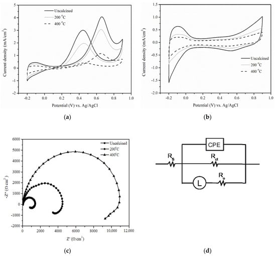 Figure 1a illustrates the cyclic voltammetry (CV) of Pt-Ba0.5AlOx/C catalysts with Ba0.5AlOx exposed to different calcining temperatures. All the catalysts had similar forward peak potentials, namely, 0.66, 0.65, and 0.65 V. However, the maximum current density in the forward sweep of CVs for CH3OH oxidation and electrochemically active surface area (ECSA) are important properties for determining elements in the evaluation of the MOR activity of an electrode in DMFCs. A catalyst with a large ECSA usually possesses a high electrocatalytic activity [24]. In Figure 1a,b, the performance of the obtained uncalcined Ba0.5AlOx catalyst was higher than that of the two other catalysts at calcining temperatures of 200 °C and 400 °C. This result indicated that the maximum current density (3.89 mA/cm2) and ECSA (49.83 m2/g) for MOR of the uncalcined catalysts were higher than those of the catalysts calcined at 200 °C (2.89 mA/cm2 and 25.12 m2/g) and 400 °C (1.08 mA/cm2 and 22.52 m2/g). The charge transport properties of various catalysts were assessed by using the Nyquist plots of the electrochemical impedance spectra (EIS) measurement; the diameter of the primary semicircle is closely related to charge reaction resistances (Rct) associated with MOR [25]. The small diameter of the semicircle corresponds to the high electrocatalytic activity of a catalyst for MOR. As shown in Figure 1c, the diameter of the primary semicircle for the impedance data could be modeled in the equivalent circuit model illustrated in Figure 1d [25,26]. The circuit elements used were as follows: Rs is the solution resistance, Ro is the contact resistance between the catalyst and the support electrode, and a constant phase element (CPE) is the double-layer capacitance, which is associated with the adsorption of intermediates formed during MOR [25]. In Figure 1c, Rct of 20%Pt-Ba0.5AlOx/C catalysts prepared with the uncalcined Ba0.5AlOx was smaller than that of the catalysts calcined at 200 °C and 400 °C. These results indicated that the ion transfer rate of the MOR of the 20%Pt-Ba0.5AlOx/C catalyst prepared by uncalcining Ba0.5AlOx was faster than that of the two other catalysts calcined at 200 °C and 400 °C because of the presence of conductive carbon support [12]. Thus, the best electrocatalytic activity of the catalyst for MOR was obtained.