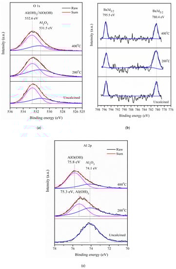O 1s, Ba 3d, and Al 2p XPS of Ba0.5AlOx under different calcining temperatures are shown in Figure 4. The binding energies of O 1s and Ba 3d were similar in the uncalcined Ba0.5AlOx catalysts or the catalysts calcined at 200 °C and 400 °C. The peak at a binding energy of O 1s for each catalyst displayed the aluminum hydroxide (Al(OH)3) or aluminum oxyhydroxide state (AlO(OH)) at 532.4 eV and aluminum oxide (Al2O3) at 531.33 eV [28]. The existence of −OH possibly causes Al2O3 to react with water, forming Al(OH)3 [29]. In this reaction, water is from the catalyst exposed to the atmosphere (moisture) before XPS measurement [30] and Al2O3 that reacts with Al(OH)3 to generate AlO(OH) [29]. The peaks at binding energies of 780.4 and 795.5 eV for all the catalysts can be assigned to Ba 3d5/2 and 3d3/2 core lines of Ba2+, respectively [31]. Particularly, the binding energies of Al 2p XPS varied among the Ba0.5AlOx catalysts calcined at different temperatures. Only one peak binding energy at 74.1 eV was obtained for the uncalcined Ba0.5AlOx. However, when the calcining temperature increased to 200 °C and 400 °C, the peaks of the binding energies of Al 2p positively shifted to 75.3 and 75.8 eV, which were assigned to Al(OH)3 and AlO(OH), respectively [31].