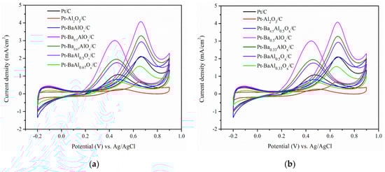 Electrochemical measurements were carried out on a computer-controlled CHI 608E electrochemical analysis instrument (CH Instruments, Inc., Bee Cave, TX, USA) in a three-electrode electrochemical cell at room temperature. A Pt spiral and an Ag/AgCl electrode were used as a counter electrode and a reference electrode, respectively. A working electrode was prepared with 20 mg of catalyst dispersed in 1.8 mL of ethanol and mixed with 0.2 mL of 5 wt.% Nafion solution via sonication for 30 min. Then, 1 μL of catalyst suspension was spread onto the surface of the glassy carbon (GC) electrode with a diameter of 3 mm and dried. Cyclic voltammetry (CV) was utilized to investigate methanol oxidation within a potential range of −0.2 V to 0.9 V at 50 mV/s in 0.5 M H2SO4 containing 1 M CH3OH. Hydrogen adsorption-desorption peaks were obtained in 0.5 M H2SO4, which was deaerated with ultrapure N2 gas for 30 min before each experiment. The long-term durability of the catalysts was tested by conducting 1000 continuous potential cycles between 0.05 and 1.20 V at 50 mV/s. Electrochemical impedance spectra (EIS) were obtained at 0.4 V and 100 kHz–0.01 Hz in 1 M CH3OH and 0.5 M H2SO4 mixture. The electrochemically active surface area (ECSA) could be obtained using the following Equation: ECSA (m2/g) = QH/(0.21 mC/m2 × mPt) [45]. QH (mC/cm2) is the average of integrating the hydrogen adsorption and desorption area (mA/cm2·V) by utilizing Origin 8.0 (OriginLab Corporation, Northampton, MA, USA) and dividing the screen rate (V/sec). Furthermore, 0.21 mC/cm2 was set for the oxidation of a hydrogen monolayer on a Pt electrode [44], and corresponding to 20%Pt loaded on the BaAlOx catalysts on a disk electrode, it was 0.24 g/m2.