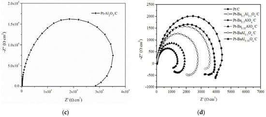 Furthermore, the ECSA of the different catalysts is shown in Figure 5b and Table 1. The results showed that the MOR of 20%Pt-Ba0.5AlOx/C catalysts was dependent on the largest ECSA (49.83 m2/g) among the catalysts. In Figure 5d, Rct of 20%Pt-Ba0.5AlOx/C catalysts was lower than that of 20%Pt/C catalysts and other catalysts, and this parameter corresponded to the high electrocatalytic activity of MOR.
