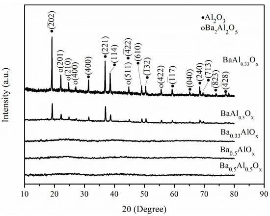 XRD of various BaAlOx powders prepared at different ratios of Ba and Al contacts.