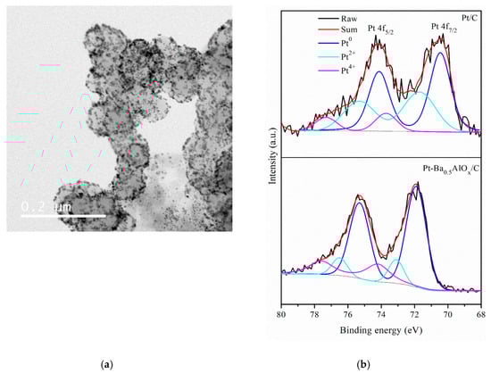 (a) TEM image of 20%Pt-Ba0.5AlOx/C and (b) Pt 4f XPS of two catalysts.