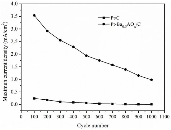 The long-term electrochemical stability of 20%Pt/C and 20%Pt-Ba0.5AlOx/C catalysts in MOR was investigated by performing 1000 continuous potential cycles in 1 M CH3OH + 0.5 M H2SO4 solution (Figure 9). Clearly, the current density of both samples decayed when the number of cycles increased. The maximum current density of the 20%Pt-Ba0.5AlOx/C catalyst was still higher than that of the 20%Pt/C catalyst after 1000 cycles. Therefore, the long-term electrochemical stability of 20%Pt-Ba0.5AlOx/C catalysts was better than that of 20%Pt/C catalysts, which was attributed to the efficient removal of the intermediate species benefited from the synergetic effect [19] between Pt and Ba0.5AlOx.