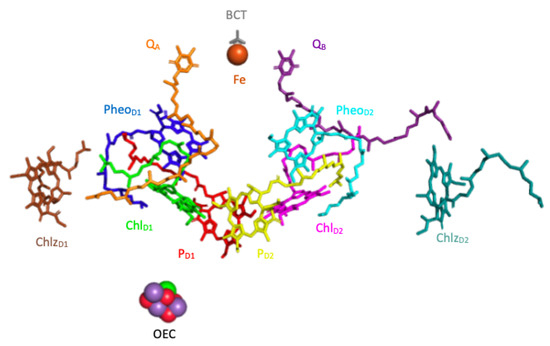 The PSII RC is comprised of D1 and D2 proteins, core antenna proteins CP43 and CP47, and several small subunits [1,2]. Similar to reaction centers found in purple bacteria, the D1 and D2 proteins comprise the core of the PSII RC along with a number of noncovalently associated cofactors, including pheophytins, two quinones, and an iron ion (), as shown in Figure 1 [3]. Located near the PSII RC, the oxygen-evolving complex (OEC), made up of a cluster, is responsible for water oxidization [4,5] which makes the PSII RC unique.