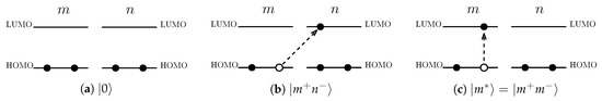 We represent the reaction center of PSII as a pigment–protein complex (PPC), a molecular aggregate of M pigments being held in a protein scaffolding. Molecular excitations of the pigments in the PPC are described in terms of electrons and holes residing in the highest occupied molecular orbital (HOMO) and the lowest unoccupied molecular orbital (LUMO) within each pigment [19]. The ground state of the PPC, , is defined as the state in which all of the HOMOs are occupied and all of the LUMOs unoccupied (see Figure 2a). The excited state of the PPC, is defined to have one hole in the HOMO at pigment m and one electron in the LUMO at pigment n (see Figure 2b). In what follows, we refer to the excited state for as the charge transfer (CT) state and that for as the Frenkel exciton (FE) state which is denoted by (see Figure 2c). The total charge is conserved under these excitations so the PPC as a whole remains neutral.