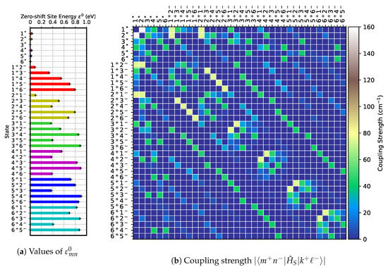 where runs for all values of n except m. Here the first term of Equation (10) describes the coupling between the vibration and the electron–hole pair in the FE states at pigment m with the strength , and the second term describes the coupling between the vibration and individual electrons (holes) in the CT states at strength (). We further assume that the coupling constants of the CT states are proportional to that of the FE states, , with site-dependent scaling factors . By this assumption, the system–bath coupling Hamiltonian is simplified as