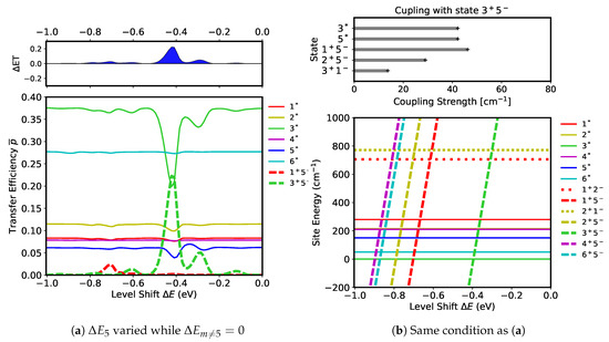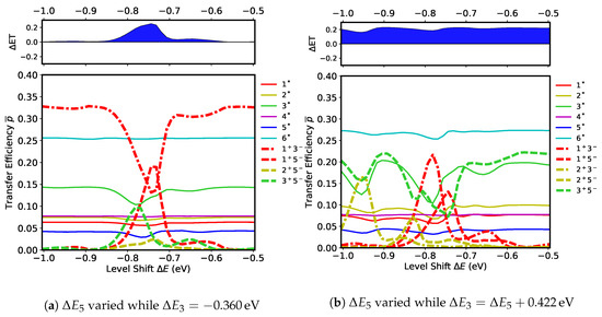 Next, the effects of the level shift at on the transfer efficiencies are examined. Simulations were run for a range of keeping all other level shifts unchanged at zero, . The results from these simulations are shown in Figure S1a of the Supplementary Materials. Remarkably, three large peaks of the CT states are seen in the transfer efficiency, (dash-dotted red) at ), of (dash-dotted blue) at ), and of (dash-dotted yellow) at ). As shown in Figure S1b of the Supplementary Materials, these peaks correspond to the resonance of the three CT states, , , and , with FE states at their crossing points. Thus three radical pairs , , and are formed by this resonance. The site energies of and are also crossing with those of FE states (shown in Figure S1b), but they remain inactive because they are coupled only weakly with FE states, as can be seen in Figure 5b.