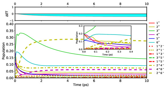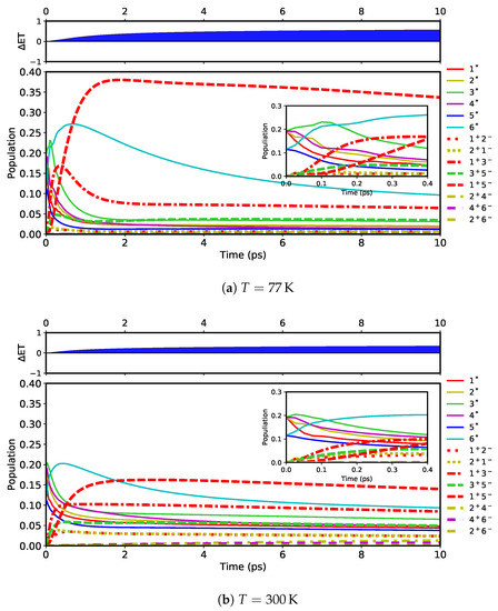 Population and dynamics of FE and CT states for the CT pathway of Out of the 36 states used for computations, only the selected 14 states are displayed for clarity. The levels shifts are set to , , and . ΔET at each moment of time t has been computed by setting τ = t in Equation (7). The insets show the populations for the first 400 fs. (a) Results for 77 K. (b) Results for 300 K.