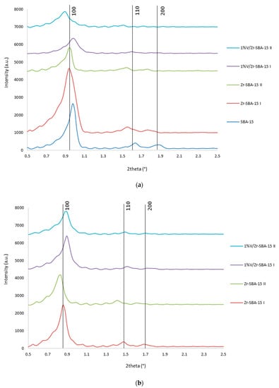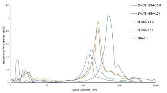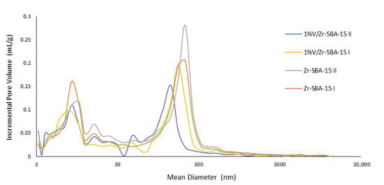 In the case of adding vanadium by impregnation, the volume of pores, their diameter and the specific surface area of SBET decreased. The incorporation of Zr and V into the support reduces its surface area by approximately 30% (Table 2). We think that this is due to the formation of VOx layers in the pores and surface of the support, as well as the formation of small fragments resulting from the impregnation and subsequent heat treatment of the catalysts. In addition, the volume and diameter of the mesopores decreased by 10% to 20% with impregnation; lower volumes were observed for the 1%V/Zr-SBA-15 II catalyst. The presence of macropores, along with a shorter length of mesoporous channels, improved the throughput of the reactants to active centers and the removal of products from the catalyst.