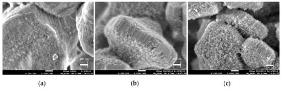 The mesoporous SBA-15 structure in the vanadium catalysts was also confirmed by SEM. The SBA-15 and Zr-SBA-15 supports (Figure 3) showed a well-developed mesoporous structure very similar to the vanadium catalysts (Figure 4). The ordered SBA-15 structure with cylindrical hexagonal pores can be clearly distinguished in the SEM images of all samples. A greater share of small fragments produced during the impregnation and heat treatment of the catalysts was found. Embedding zircon into the structure caused the formation of particles of different thicknesses in the direction of the longitudinal axis of the pores. While the SBA-15 particles presented a thickness of 250–350 nm, Zr-SBA-15 I had a thickness of 150–200 nm and Zr-SBA-15 II was slightly thinner at about 130 nm. The shorter channel length was beneficial due to the diffusion of reactants into the pores and products from the pores, as measured in the resulting tests.