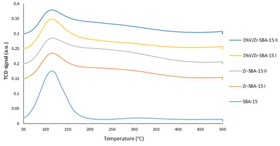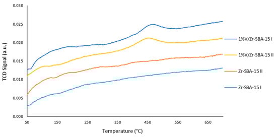 Due to the low content of vanadium in the catalysts, the changes in the temperature-programmed reduction (Figure 7) were not significant between the two vanadium catalysts. There was only a slight shift of the reduction peak at 462 °C for the V/Zr-SBA-15 I catalyst and at 470 °C for the V/Zr-SBA-15 II catalyst.