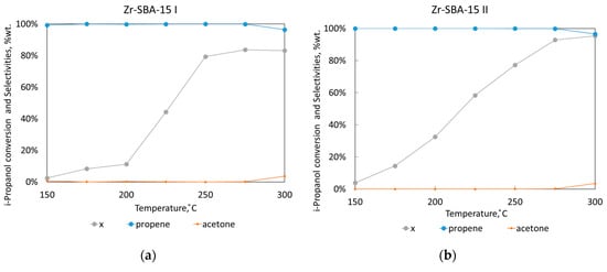 Isopropanol conversion and selectivity to propene and acetone for the Zr-SBA-15 I (a) and Zr-SBA-15 II (b) catalysts.