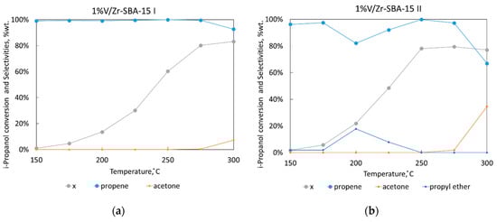 Isopropanol conversion and selectivity to propene and acetone for the 1%V/Zr-SBA-15 I (a) and 1%V/Zr-SBA-15 II (b) catalysts.